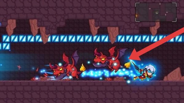 这是一款横版动作闯关游戏,画面里能看到:一位右侧手持武器、摆出战斗姿态的角色,还有两只红色的小龙模样的怪物;场景设计成地牢风格,展现出紧张的战斗追逐场景;玩家需要操控角色攻击怪物,同时躲避途中的障碍,一步步推进关卡。