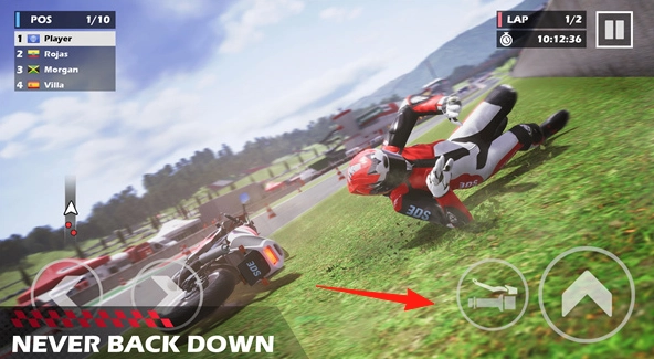 玩法机制是操控摩托在赛道上竞速,借助虚拟按键(左右转向、加速)来操作,要维持一定速度(比如212KPH),并超越Rojas、Morgan等对手,最终完成规定圈数(如1/2圈)。