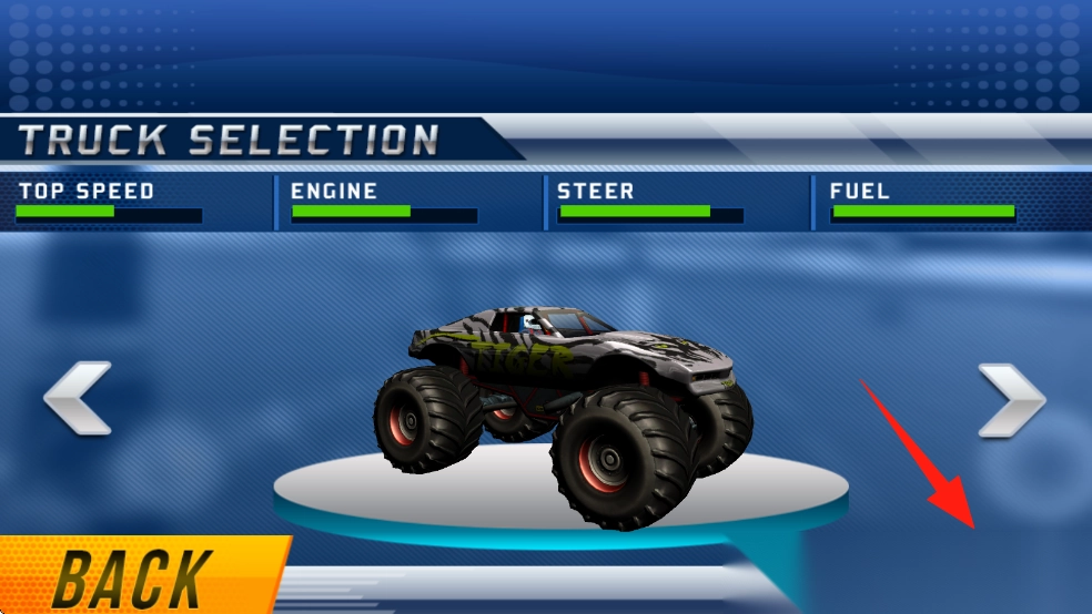 点击“PLAY”按钮进入游戏,在卡车选择界面中,先查看各辆卡车的属性信息,然后挑选心仪的卡车,最后点击“SELECT”按钮完成选择确认。