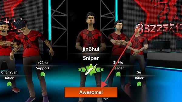 在角色界面确认“jin6hui(Sniper)”等队员的分工,包括Support、Leader,点击“Awesome!”后进入匹配,准备进行团队竞技。