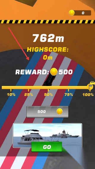 结算完成后可领取【500金币】奖励,点击【GO】按钮重新出发,刷新您的行驶纪录。