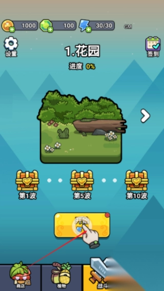 场景选择:点击“花园”等场景,确认进度后点击“开始”按钮进入关卡。