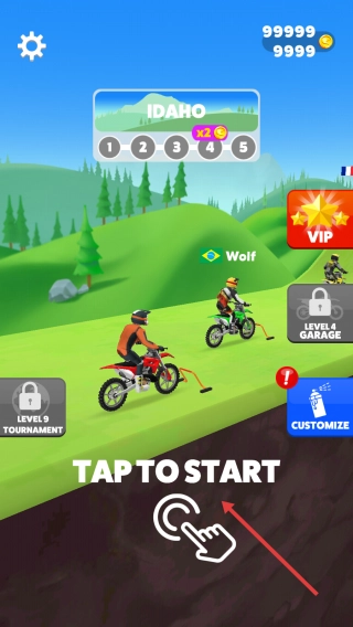 点击【TAP TO START】按钮,选择Idaho场景下的红色摩托,花费99999金币,开启LEVEL1关卡。