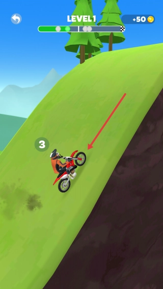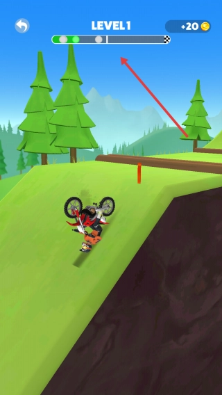 遇到陡坡时,要控制好摩托车的平衡与油门,避免坠落,同时收集“+20”“+50”的金币,以便继续骑行。
