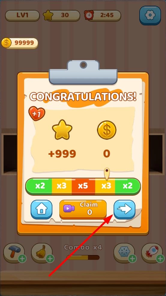 完成货物摆放后,只要满足关卡要求就能过关,此时界面会出现恭喜信息,点击“Claim”右侧的箭头按钮,就能进入下一关并领取关卡奖励。