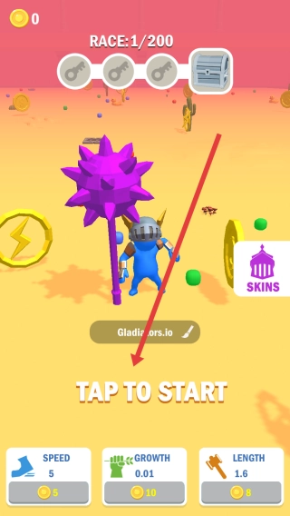 点击【TAP-TO-START】按钮,进入《Gladiators.io》游戏,操控持有紫色武器的角斗士角色,开启沙漠场景的竞技对战。