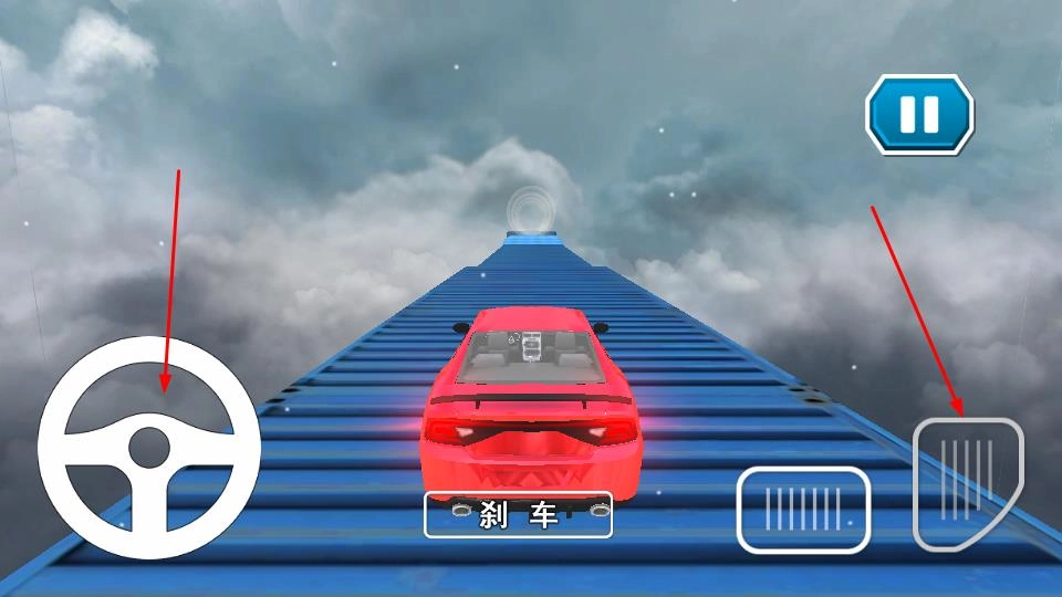 在游戏进行时,你可以用左边的虚拟方向盘来操纵车辆的走向,再利用刹车和油门踏板来调节车子的速度,从而在高空赛道上稳稳地驾驶前行。