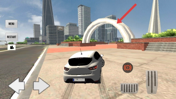 需要驾驶汽车朝着前方的拱形建筑方向行驶,抵达该目标区域,完成目标任务。