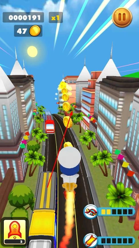 在角色奔跑的途中,路面上会不断出现金币,你需要操控角色去收集这些金币,与此同时,还得留意避开形形色色的障碍物。