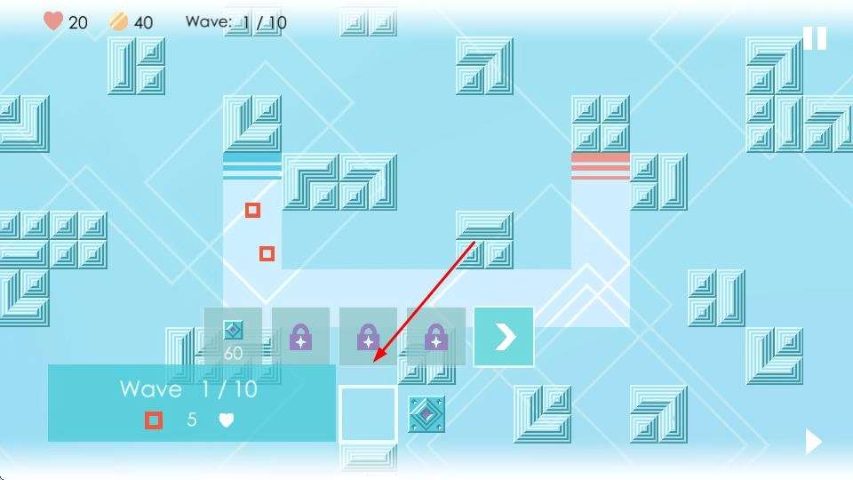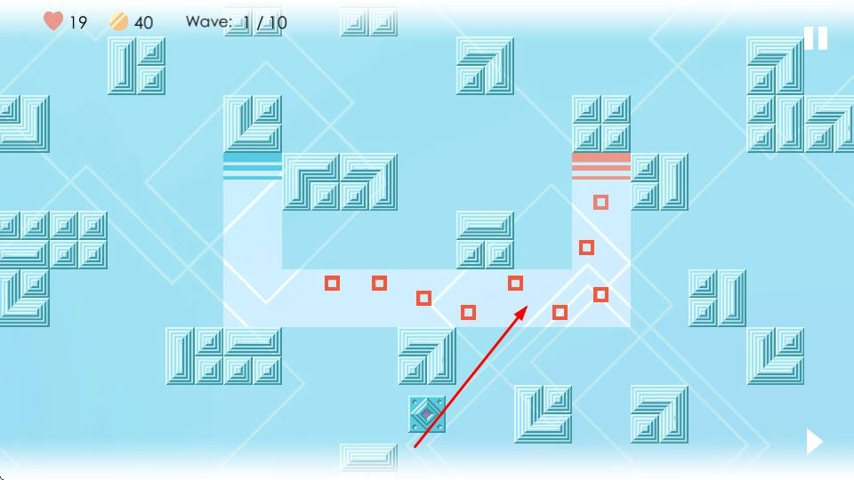 进入主界面后,点击【START】按钮,接着选择像素风格的初始地图和挑战难度,最后滑动屏幕就能进入炮塔布置场景。