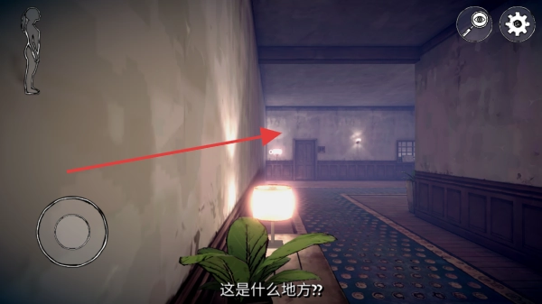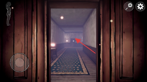 在光线昏暗的走廊场景中,你需要操控虚拟摇杆,依照箭头的指引一步步向前探索;同时要留意周围环境,寻找可能的线索;当遇到门时,不妨尝试与之交互。
