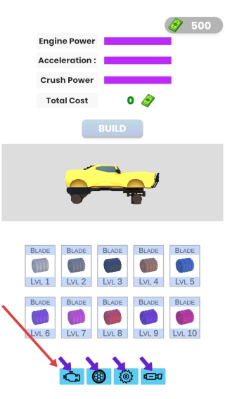 在改装界面,选择部件(例如BLADE)进行升级,然后点击【BUILD】按钮生成战车。