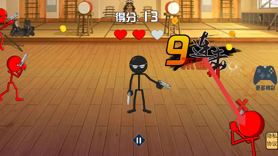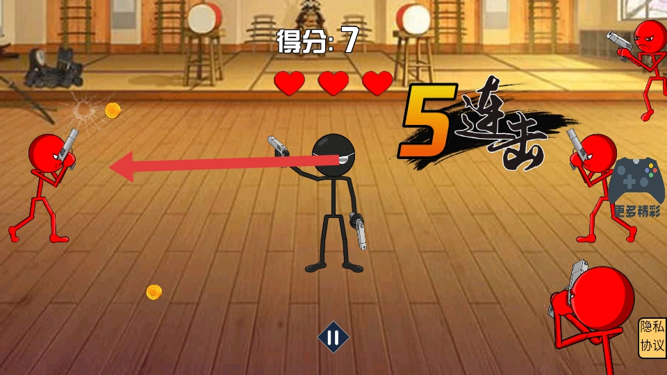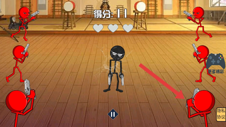 进入游戏后,你需要操控黑色火柴人,在被四周持枪的红色敌人包围的情况下,迅速瞄准并射击。要充分利用自身优势,优先对靠近的敌人发起攻击,全力守护好初始爱心。