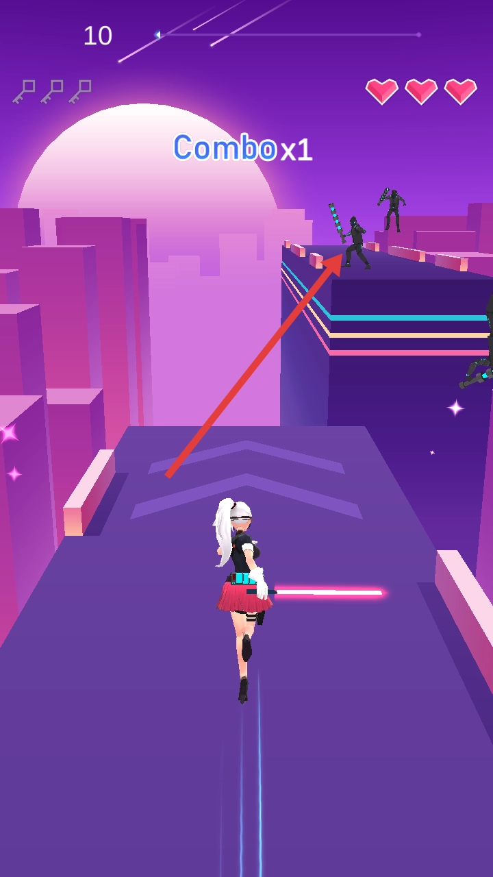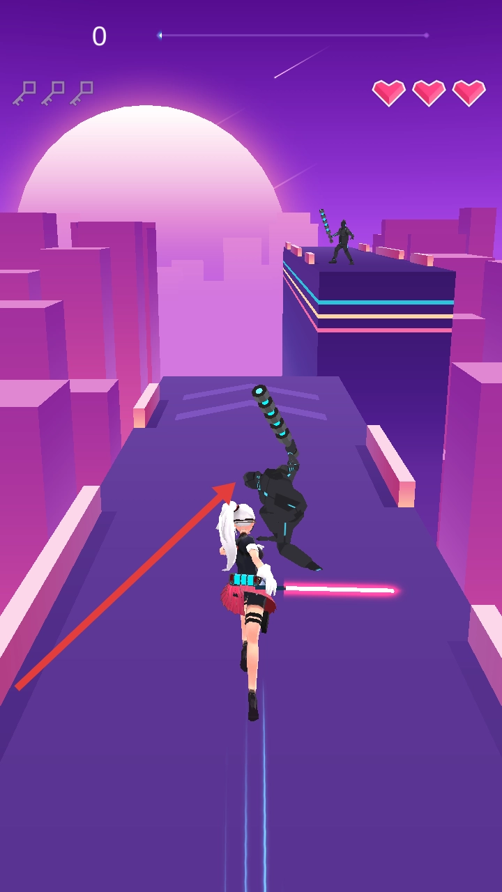 踏入节奏跑酷的世界,操控手持红色利刃的角色,沿着紫色的路径不断前进,当遇到黑色机甲敌人时,跟随节奏点击屏幕发起攻击。