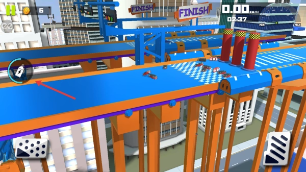 在赛道驾驶过程中,需沿着蓝色跑道行进,使用左侧的道具,避开障碍物并朝着【FINISH】线全力冲刺。