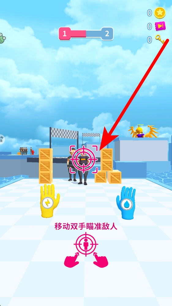在熟练掌握左手移动的操作后,系统会弹出提示引导玩家进行双手移动瞄准敌人的练习。这时,新手玩家需要着重练习双手的协调配合,通过精准操控将瞄准框对准目标敌人,为发起攻击做好准备,以此逐步提升射击的准确性。