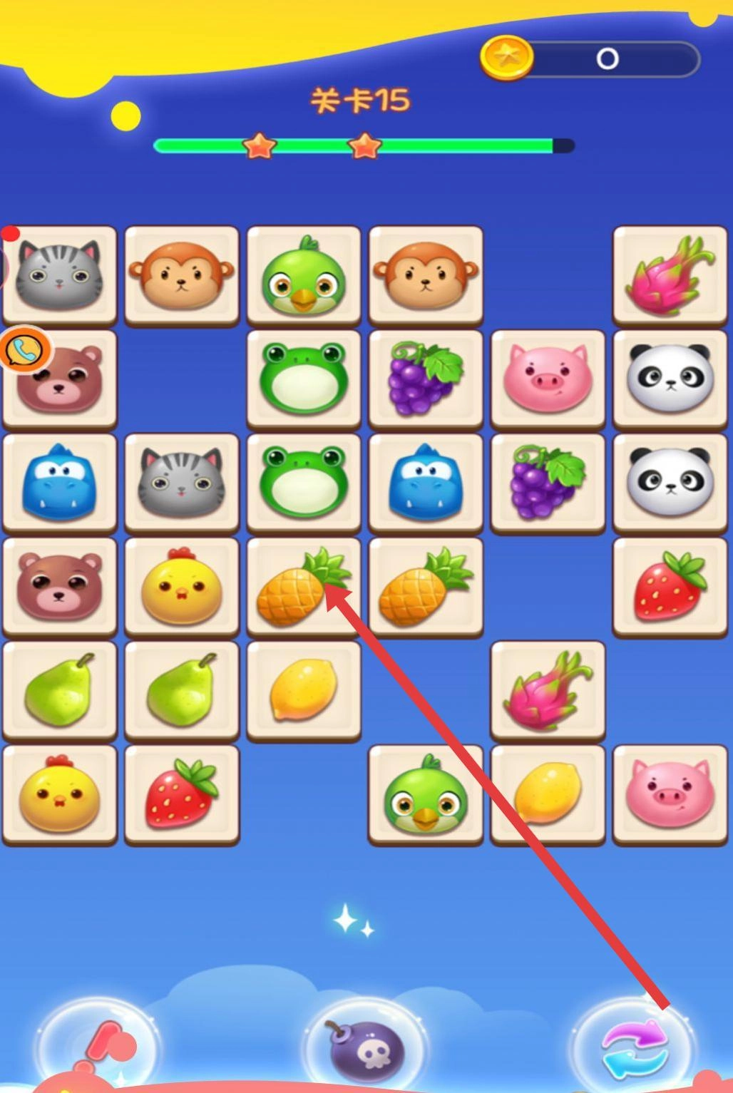 在关卡15中,点击下方的菠萝图标,将其与相邻的同色菠萝进行连线。如果步数不足,可以使用右下角的【交换】道具来调整布局。