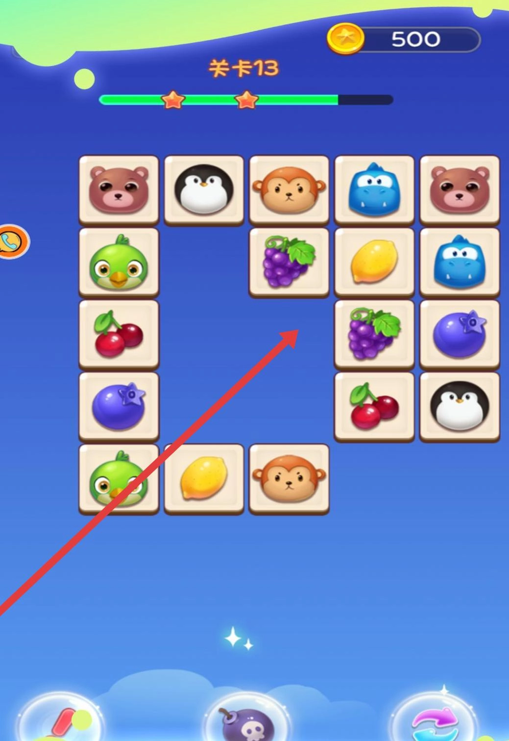 在关卡13中,先找到右侧的紫色葡萄,通过移动让它们三个连成一条直线,消除后会引发连锁反应,这样就能快速完成消除啦。