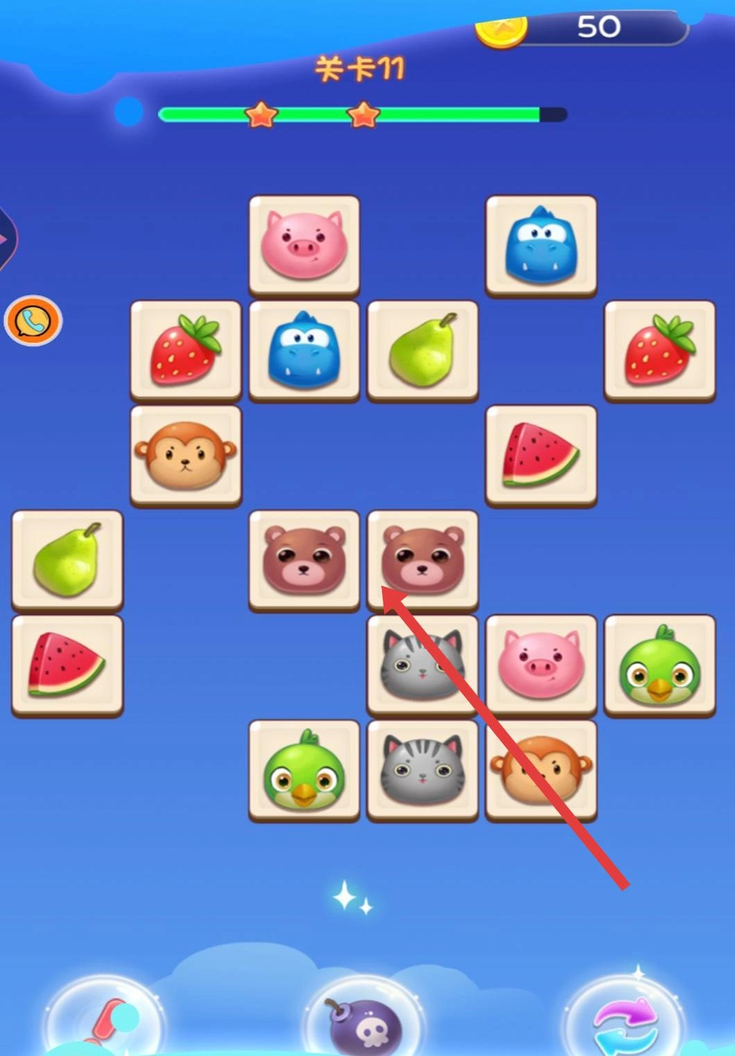 关卡11的玩法是找到两个相邻的小熊图标,通过横向或纵向连线来消除它们。在消除过程中,建议优先清理同色的动物图标,这样能更有效地推进关卡目标。