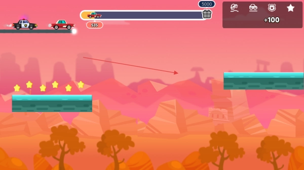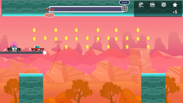 进入游戏后,操控红色汽车在道路上行驶,注意观察上方的进度条以及40这类数字,同时收集道路上的黄色星星道具。