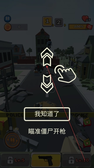 游戏启动后,根据提示滑动屏幕来调整瞄准方向,一旦有僵尸出现,就点击开枪按钮,对准僵尸进行射击。