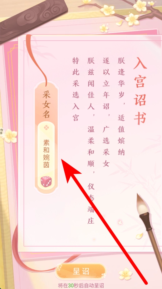 创建角色时会生成一份入宫诏书,里面记录着采女名等相关信息。通过这份诏书,你能知晓角色的初始设定,为后续开启宫廷生活做好铺垫,助力角色以特定身份踏入宫廷世界。