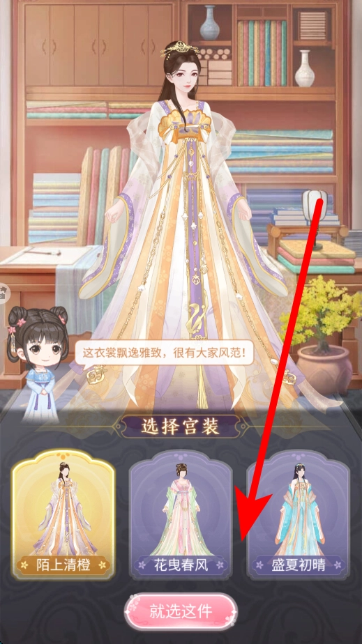 在为角色进行装扮时,你可以选择宫装风格的服饰。这里有陌上清橙、花曳春风、盛夏初晴等多种不同风格的宫装可供挑选。当你选好喜欢的款式后,只需点击“就选这件”按钮,就能为角色换上心仪的宫装,打造出专属于你的独特宫廷形象。