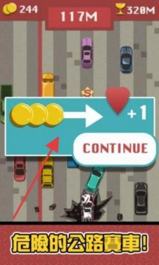 撞车后,点击【CONTINUE】按钮复活,复活后优先收集金币(+1)来延续得分。