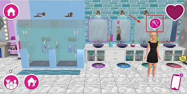 1、打开芭比梦想豪宅游戏,点击芭比头顶的图标,就能进入芭比的换装界面