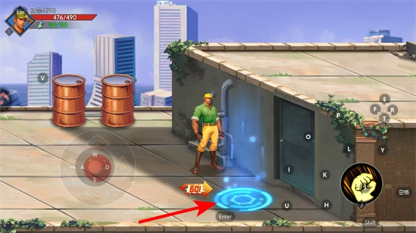 在游戏的交互场景里,点击右侧箭头所指的技能按键这类按键,就能触发和NPC的互动技能。