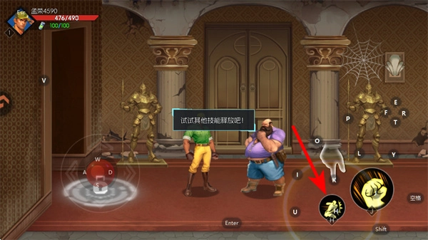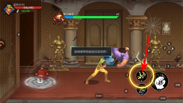 遵循箭头的提示,在战斗过程中持续点击技能按钮,触发连招技能,以此对BOSS类型的敌人造成巨额伤害。
