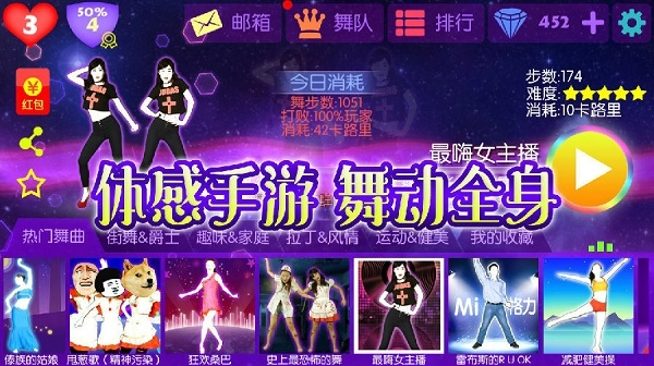 舞动达人独特的步行模式,让人在好听的音乐伴随下更为轻便的完成走路这一行为,既欣赏了音乐,消耗了卡路里,又能够获得游戏得分,为游戏中的角色加分,实在是一举多得。还可以每天领红包!