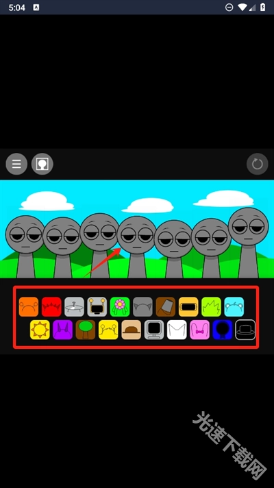 1、点击屏幕上的旗帜,进入这款富有创意的音乐游戏,和不同颜色的小人组建一支乐队,让他们在你的编排下演奏出别具一格的乐曲;