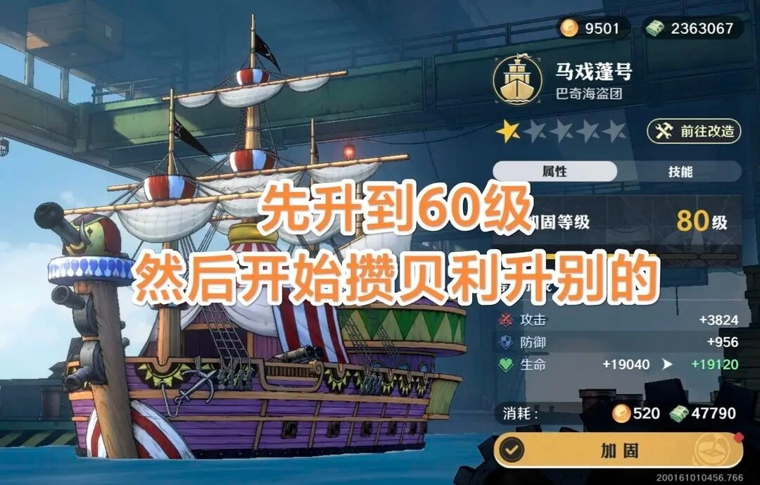 前期建议先把船升到马戏蓬号60级就好,越往后贝利会越紧缺,升级船只对贝利的消耗实在太大了!另外活动里那些可以用金币购买的船,都建议入手。