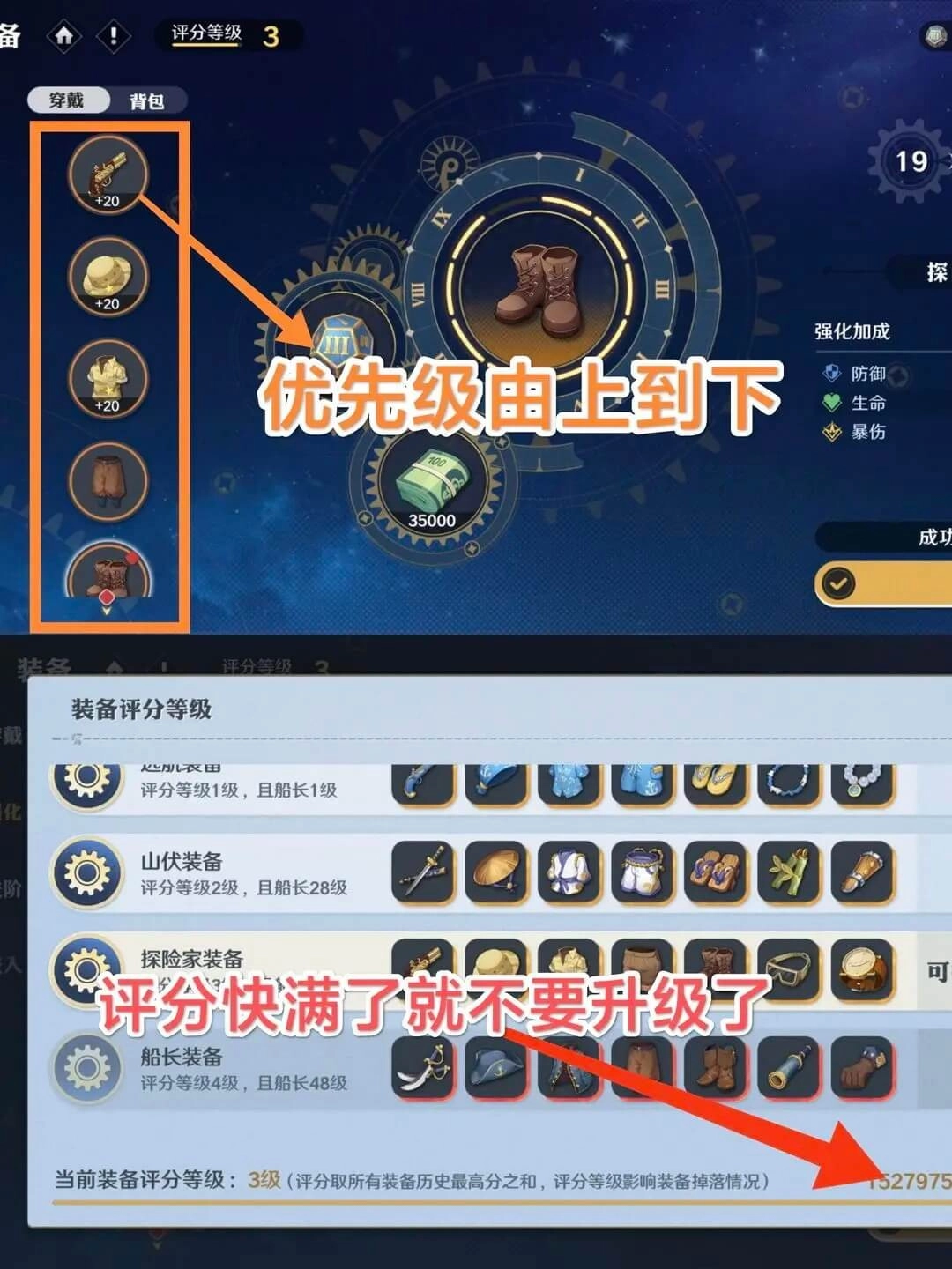 需要注意的是装备评价系统——实际上只要穿上当前拥有的最高等级装备,就能提升评价分数;分数越高,越容易掉落更高级的装备。如果目前身上的装备已是当前可穿戴的最高等级,那就给装备升级,升级优先级是自上而下的:武器最优先,接着是帽子、衣服,以此类推。但要是你现在穿的是3级装备,装备评级却已经到了4级或快要到4级,那就不用升级了。