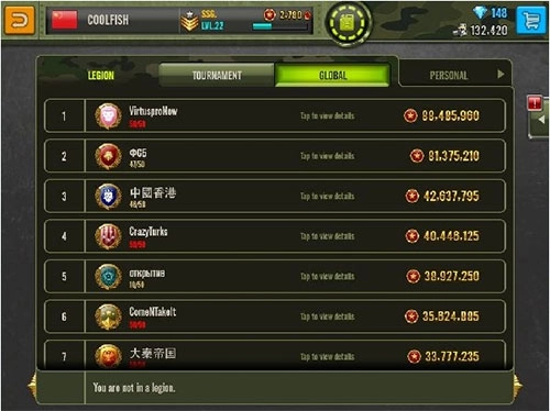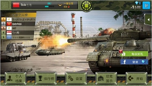 游戏界面里能看到个人信息、排名榜单、系统设置、战车陈列和开始游戏这些功能选项。界面旁的红色提示标记是聊天入口,能和其他国家的玩家交流,只是常看不懂他们的对话内容。聊天区分为世界频道和军团频道,想加入军团的话,得先在世界频道里找到发出邀请的玩家所属国家标识,点击进入后就能看到军团名称,提交加入申请通过后,就能使用军团聊天功能了。