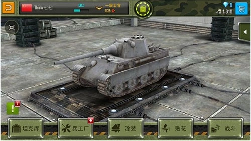 点击“开始”按钮后,你会进入游戏备战室。在这里,你可以使用坦克库(选择你拥有的、准备上场的坦克)、兵工厂(升级装甲、炮管、引擎等部件)、涂装(带有花纹的坦克外观,能提升攻击力和开火速度)以及贴花(各类标志,可增加攻击力与速度)。需要注意的是,涂装和贴花需要用钻石购买,并且有使用时间限制,通常两天左右就会失效。