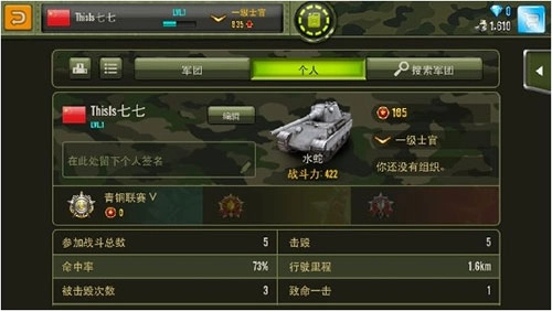 进入个人档案页面,能看到军团信息与个人信息两大板块。其中个人信息部分记录着你的比赛数据。军团内部设有不同职务,最高职位是军团长,往下依次是副团长和参谋长。当军团进入全球排名前250名时,团内所有成员都能共享总计200钻的奖励,且职务级别越高,可分得的奖励数量就越多。而职务的晋升,则取决于战斗中获取的胸章数量以及击杀敌人的数量。