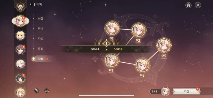 - 命座与共鸣机制相同,已通过「召唤」获取的角色,能够利用系统自动提供的「角色碎片」来完成升级。 - 当碎片积累到特定数量时,可依照角色>命座>觉醒>继承的顺序进行操作。