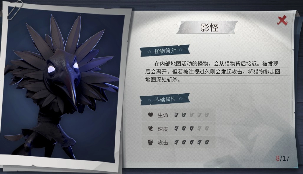 这种潜藏的诡影生物会从身后突然缠抱目标,将其拖拽至偏僻处终结;一旦被目光锁定便会畏缩退避。它能穿透障碍或利用高低差发动袭击,若目标奋力挣脱并趁其短暂失神时快速反击两次,再拉开半步距离追加两次精准攻击,即可将其击杀。