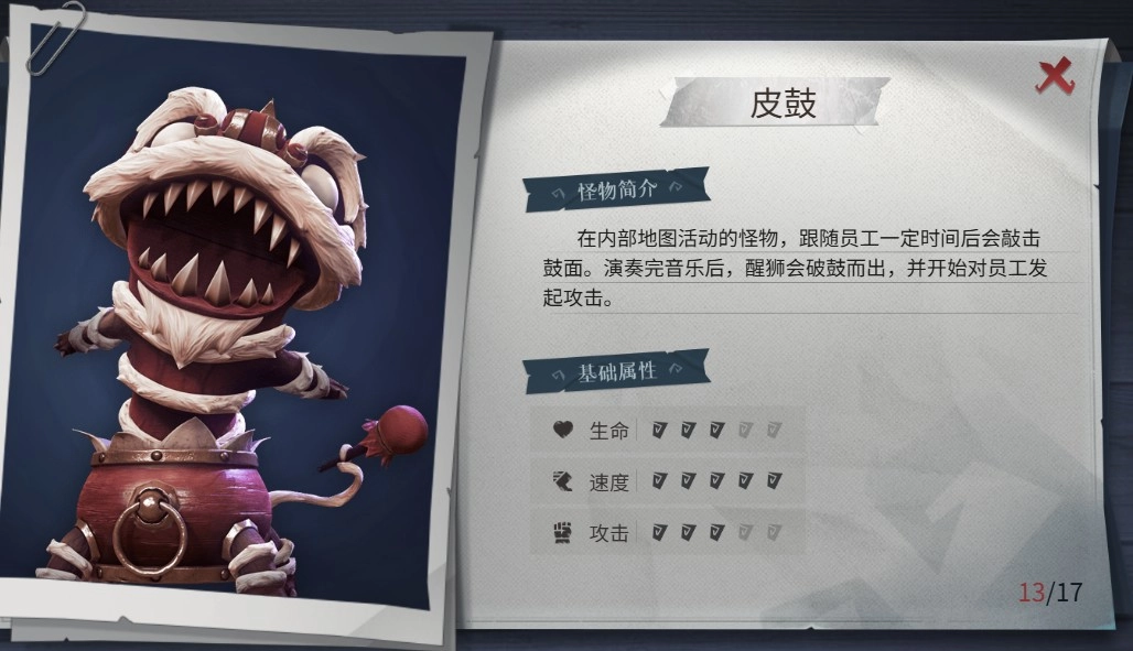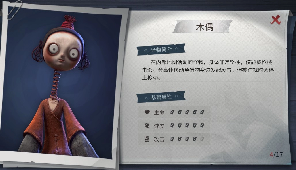 木偶:这是个无敌的怪物,得一直盯着它,能倒退着移动,被它攻击一下就会受重伤。可以通过关门来拖延时间,或者用葫芦吸两喷子解决它;要是没枪,就多利用关门,还有站在箱子上跳旋转舞让它没电,等它没电的时候赶紧关门逃跑(木偶的肩膀能站人,旁边有兵俑的话可以站到木偶后面,让它们自相残杀)。