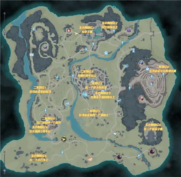 诺丁城地图上柳二龙和玉小刚的12个回忆信物,具体位置已标注在上图中。玉小刚的回忆信物是个紫色罗三炮,体积不大,需要仔细寻找;柳二龙的则是一条大火龙,大多在屋顶或烟囱上,在标注位置旁抬头就能轻松找到。
