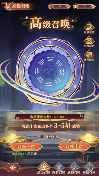 招将。招将系统是获取武将的主要渠道,玩家可通过普通招将、元宝招将、红将兑换三种方式得到武将或碎片。其中元宝招将产出基础属性较高武将的概率更大,非付费玩家建议尽量积攒元宝进行十连招募碰运气,有机会获得金卡武将;若预算充足,则无需犹豫,持续十连抽即可,组建全金阵容并非遥不可及。