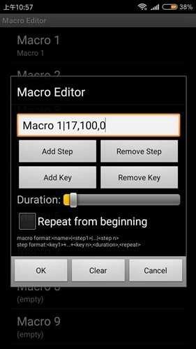 第四步:在 Macro1 编辑框内输入以下参数:17,100,0(注意使用英文逗号分隔),确认无误后点击 OK 保存。