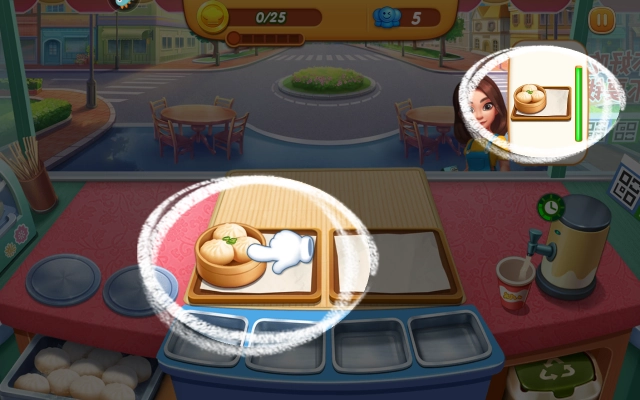 右上角那个绿色的标识代表顾客的耐心值,玩家得在顾客耐心降至临界点前把美食制作完成。