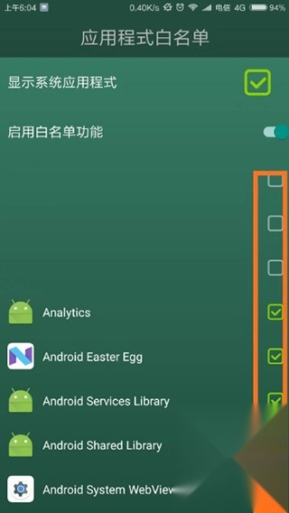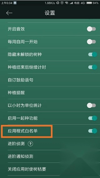 5、进入“应用程式白名单”界面后,可对所有应用进行设置:被勾选的应用属于白名单范畴,不会导致树枯萎;反之,若运行未勾选的应用,树就会枯萎。
