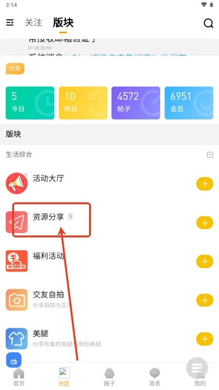 进入咕噜侠社区软件后,找到“资源分享”板块。
