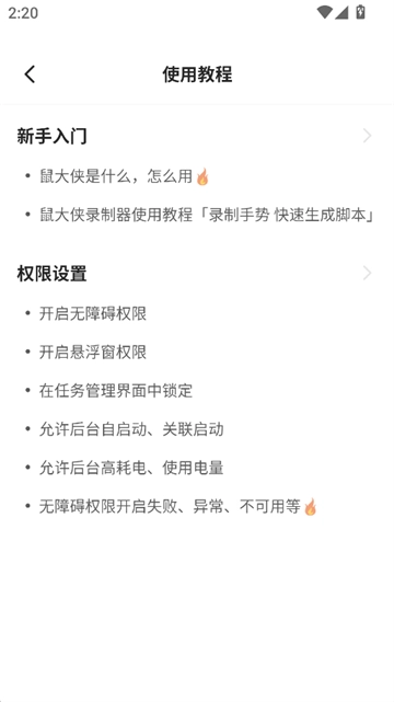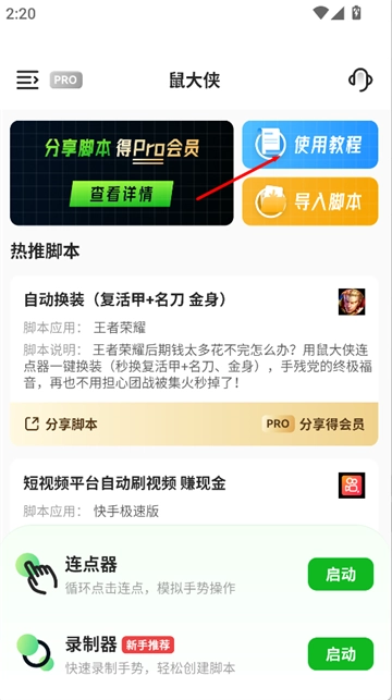 1、登录鼠大侠连点器后进入主界面,点击“使用教程”按钮,即可进入功能说明页面查看详细的操作指引。