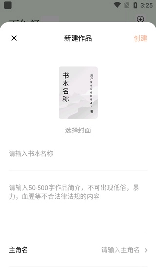 3、填写书名、作品介绍、主角姓名、目标读者群体等相关信息,点击创建按钮后就能发布作品了。