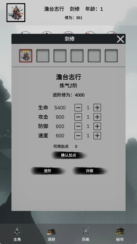 6、点击进阶,可以分配属性,但需要一定的修为。